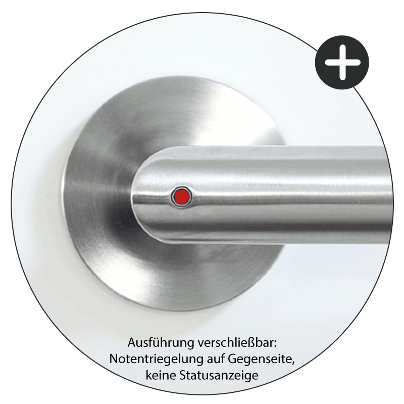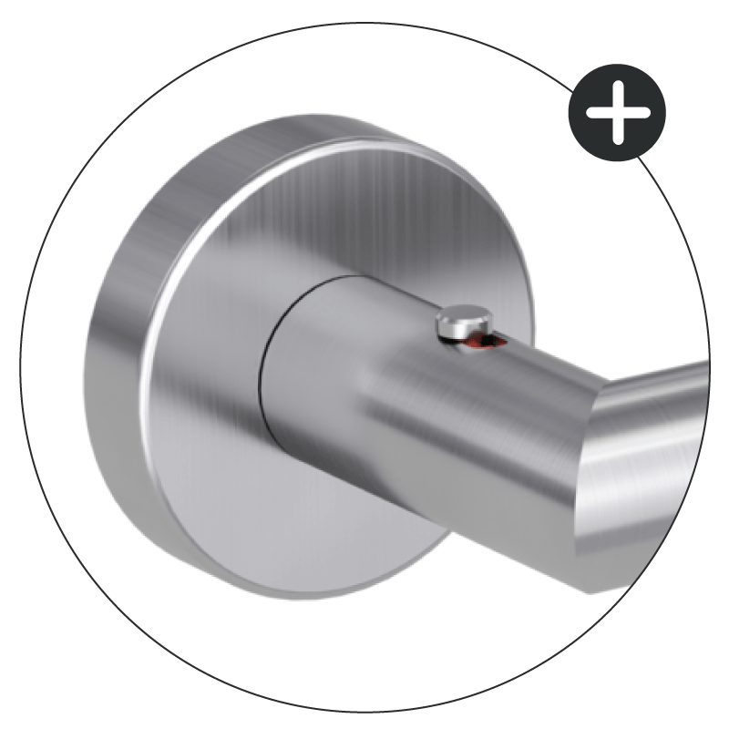 - Drücker einseitig fest/drehbar gelagert auf verdeckter Rosette mit integriertem Hochhaltemechanismus