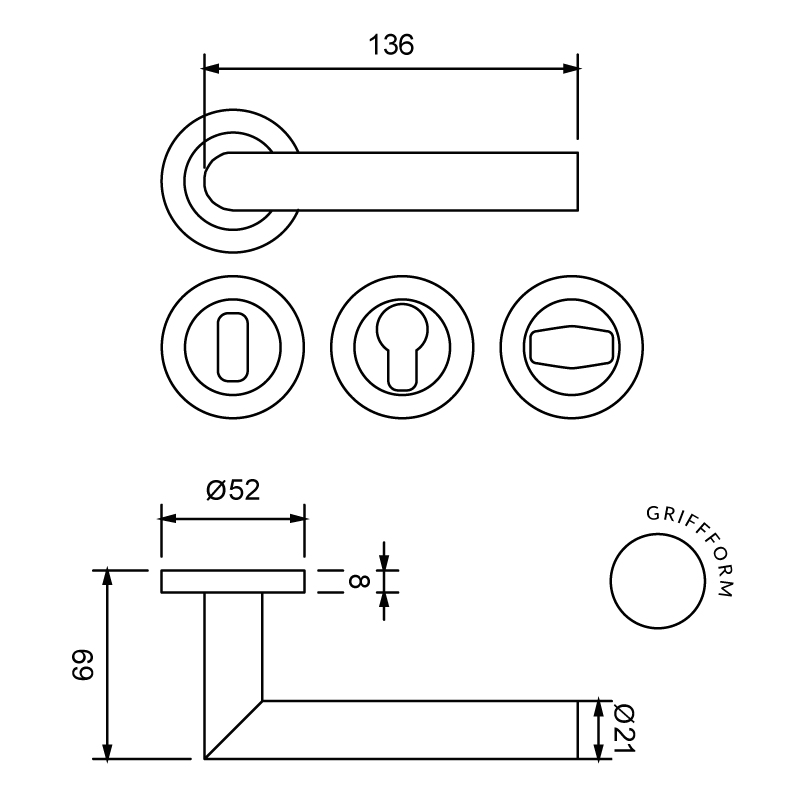 - Rosette: Ø 52 mm, Höhe 8 mm