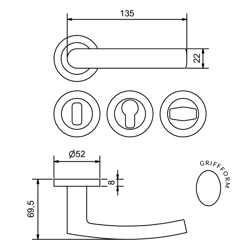 - Rosette: Ø 52 mm, Höhe 8 mm