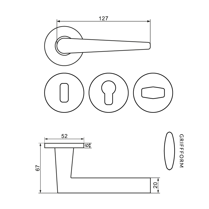 - Rosette: Ø 52 mm, Höhe ca. 6 mm