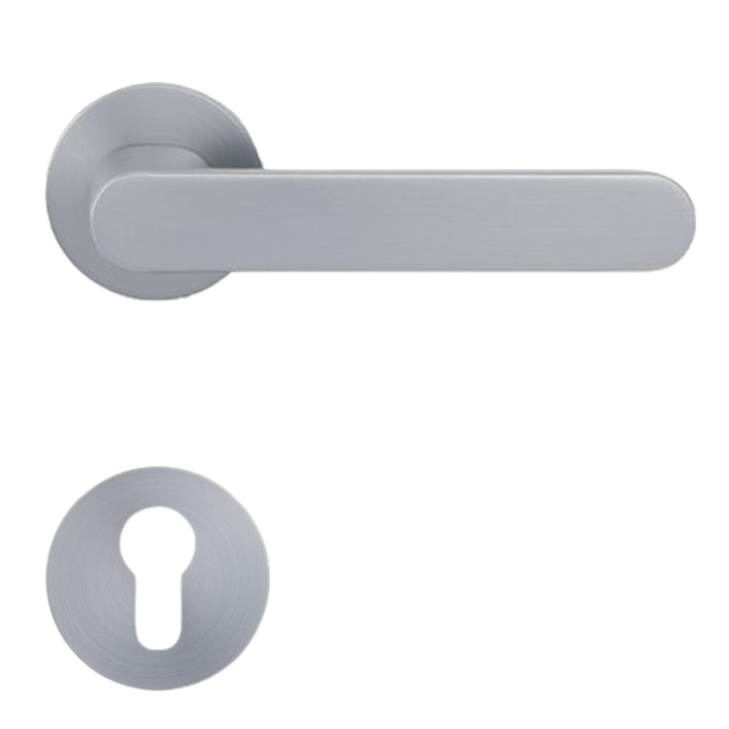 Mit der Aversa Round Garnitur in Silbergrau bringst du moderne Klarheit und freundliche Farbwirkung in Einklang. Der kantig geformte Griff verleiht deinen Türen architektonische Struktur, während die matte Oberfläche in hellem Grau für Leichtigkeit sorgt. Ideal für Räume, die bewusst modern, aber nicht kühl wirken sollen – z. B. in Kombination mit weißen Türen oder grauen CPL-Dekoren.