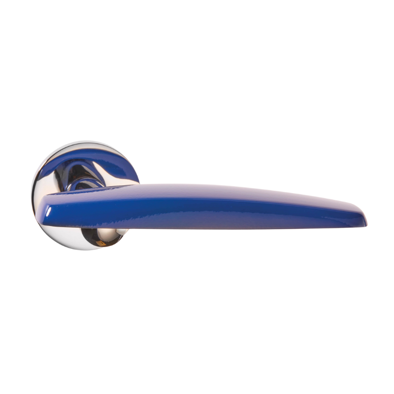 Mit dem leuchtend blauen Türgriff Seppia – Polish Blue bringst du Farbe in die Architektur: Das brillante Blau wirkt auffallend modern und wird durch die verchromte Rosette stilvoll ergänzt. Ein echtes Statement für mutige Interieurs.