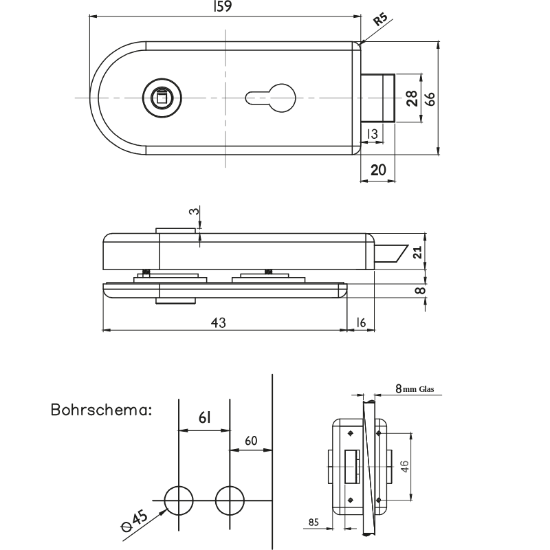- Bohrschema: Ø45 mm, Lochabstände 61 / 60 mm