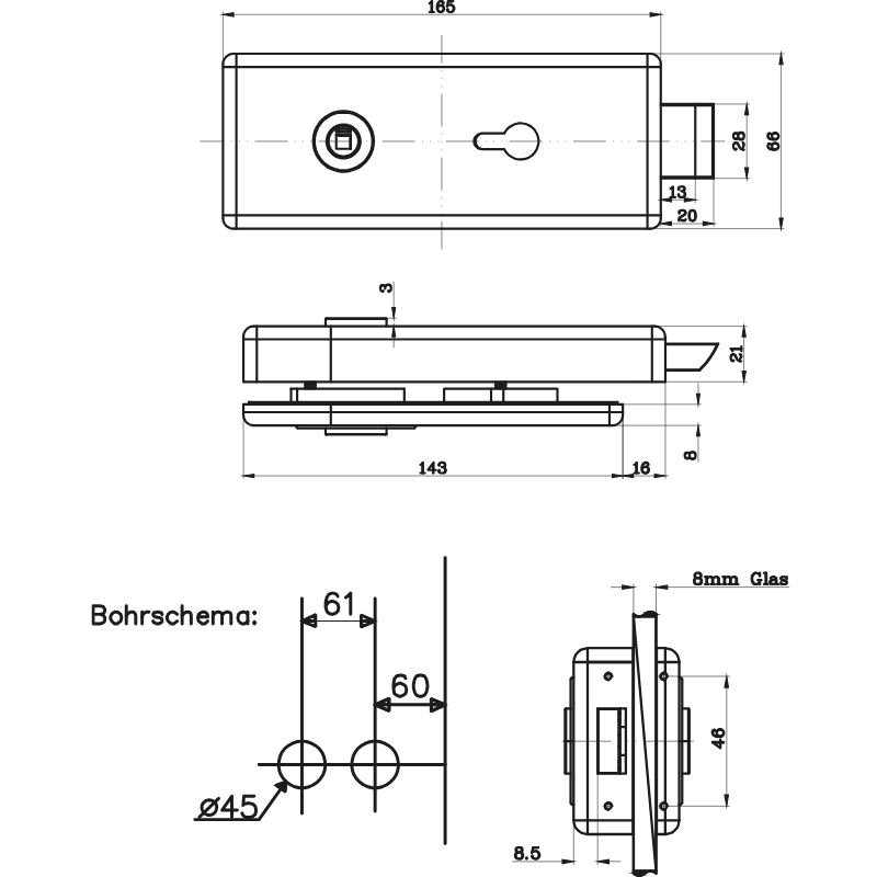 - Bohrschema: Ø45 mm, Lochabstände 61 / 60 mm