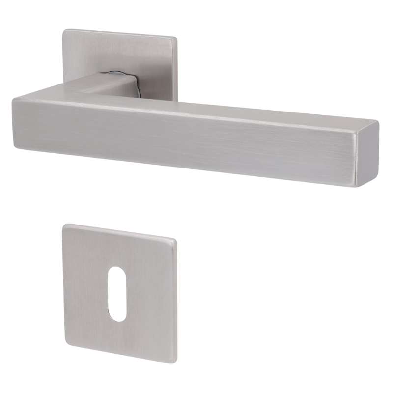 Mit hochwertigem Edelstahl, Rückholfeder und stabiler Unterkonstruktion erfüllt die Garnitur höchste Ansprüche an Komfort und Langlebigkeit. Die eckige Form und das matte Finish wirken modern und zugleich zeitlos – eine exzellente Wahl für stilvolle Innentüren.